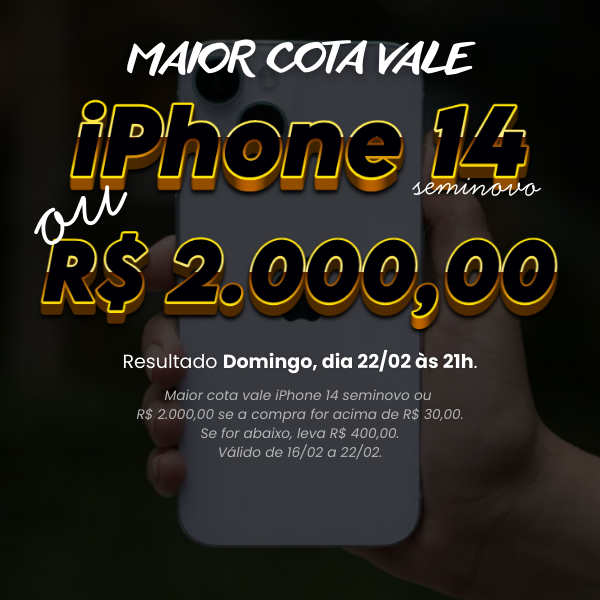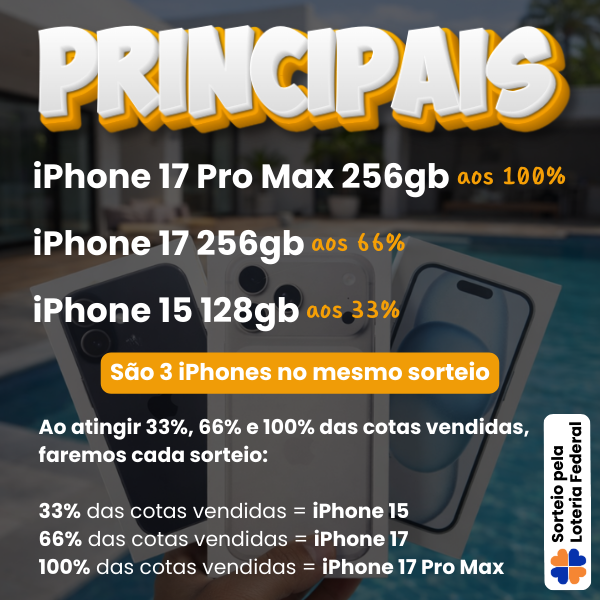 - O resultado será baseado na Loteria Federal das datas que serão marcadas aos 33% (para concorrer ao iPhone 15), aos 66% (para concorrer ao iPhone 17) e aos 100% (para concorrer ao iPhone 17 Pro Max)